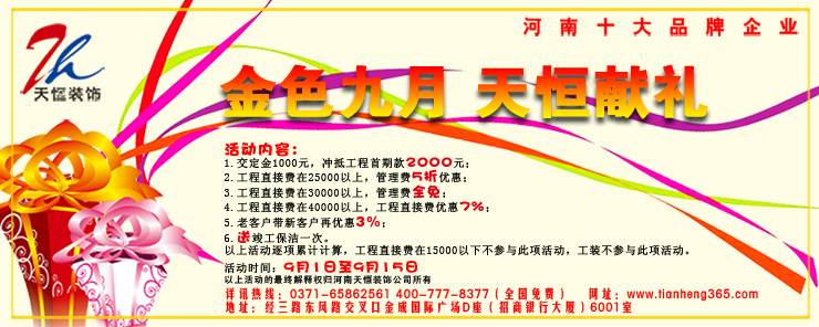 天恒裝飾9月份活動(dòng)細(xì)則 1. 交定金1000元,沖抵工程首期款2000元; 2. 工程直接費(fèi)在25000以上,管理費(fèi)5折優(yōu)惠; 3. 工程直接費(fèi)在30000以上,管理費(fèi)全免; 4. 工程直接費(fèi)在40000以上,工程直接費(fèi)優(yōu)惠7%; 5. 老客戶帶新客戶再優(yōu)惠3%; 6. 送竣工保潔一次。 7. 9月10日—12日期間交定金客戶可享受在原活動(dòng)基礎(chǔ)上再優(yōu)惠,每滿1萬(wàn)元省500元活動(dòng)(工裝除外) 以上活動(dòng)逐項(xiàng)累計(jì)計(jì)算,工程直接費(fèi)在15000以下不參與此項(xiàng)活動(dòng),工裝不參與此項(xiàng)活動(dòng)。 服務(wù)熱線:0371-65862561 65862562 活動(dòng)時(shí)間,9月1日至9月15日